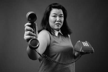 Beautiful overweight Asian woman against gray background