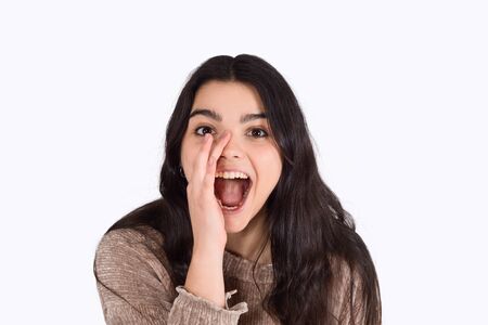 Young woman shout and scream using her hands as tube, studio shoot on white background