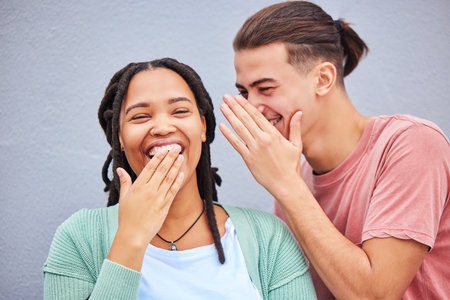 Laugh, secret and boyfriend whisper to his girlfriend a funny story, joke or information by a wall in city. Comic, happy and man talking in woman ear for gossip in town on a holiday or weekend trip.