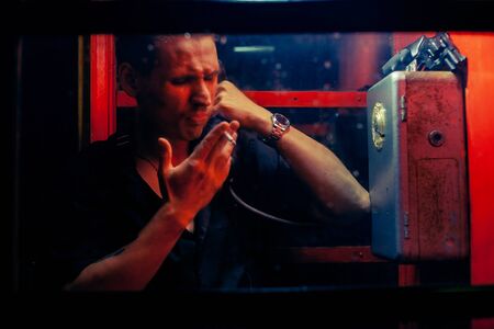 A man of criminal appearance in a payphone booth at night. Talking on the phone with a revolver and a cigarette.