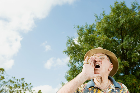 Old man in blue is screaming at something.
