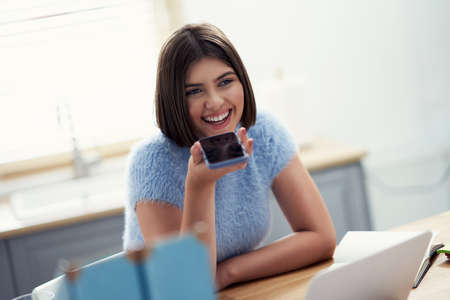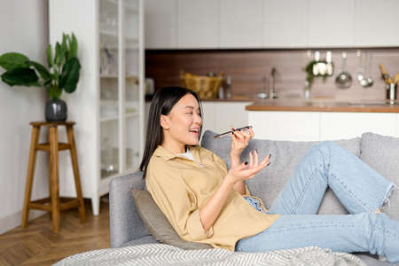 Charming young woman sitting on the sofa at home, recording and sending voice message. Female using voice recognition app on mobile phone, talking in the mic of the smartphone