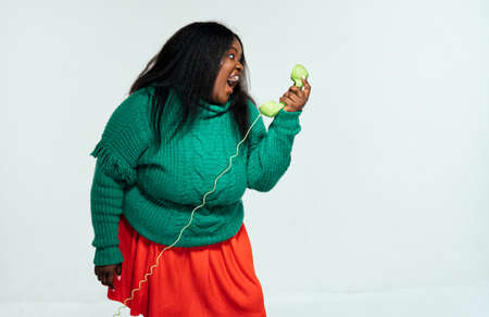 Portrait shot of an african man having a phone conversation. Isolated on the orange background.