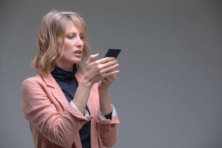 beautiful woman in a poor shirt holds a phone in her hand, gray studio background