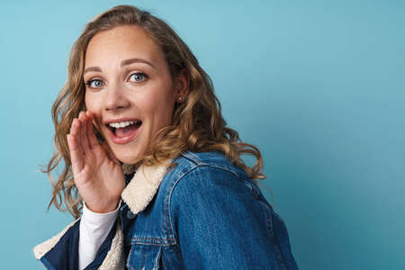 Blonde happy woman smiling and screaming at camera isolated over blue wall