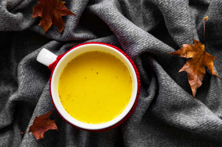 Golden milk in a white cup. Autumn leaves. A healthy drink made from milk, turmeric, cinnamon and honey.