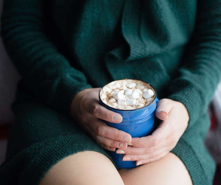white caucasian woman in green knitted cardigan holding blue cup with cacao and marshmallow, front view, vertical stock photo image