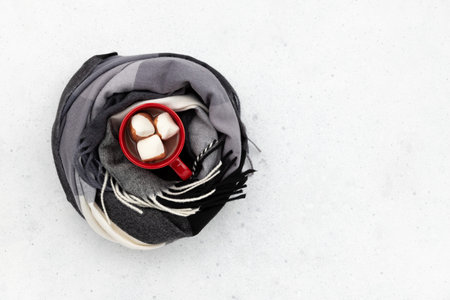 Red cup with hot cocoa wrapped in a scarf on gray background. Flat lay top view autumn winter composition.