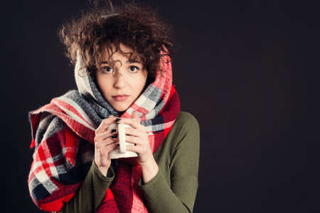 Beautiful girl keeps a large cup of hot tea. She is covered with a warm blanket
