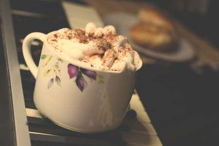 Hot cocoa with marshmallow in a white ceramic mug. The concept of cosy holidays and New Year.