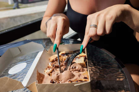 Delicious breakfast in the summer cafe. a dessert of Viennese waffles with a scoop of ice cream.