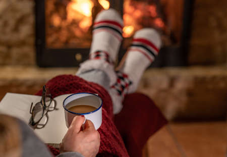 Winter night, happy woman resting by the fire with a blanket, a book, reading glasses and a cup of coffee, feet in wool socks. Cozy scene.