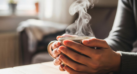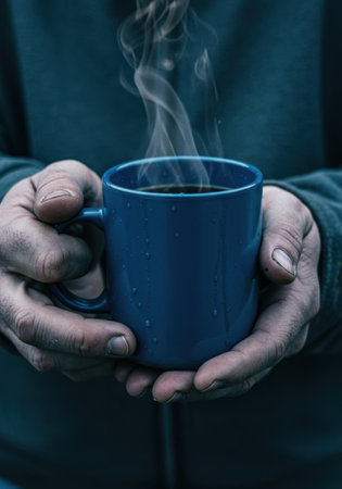 A cozy scene featuring hands holding a warm mug by a glowing bonfire at dusk, perfect for evoking feelings of comfort and tranquility in nature.