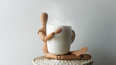Wooden Human Sitting With Holding Coffee Cup, Hand Holding Smoke on Coffee Cup, Front View, Empty Space,