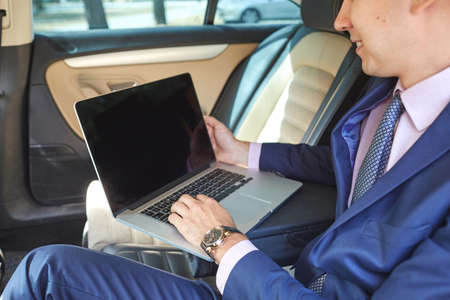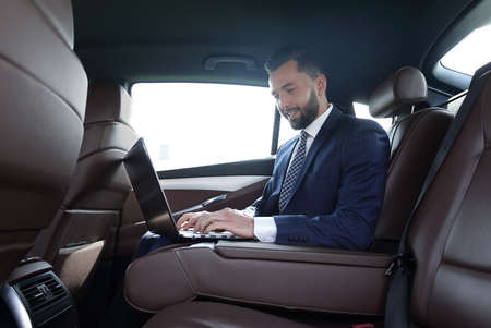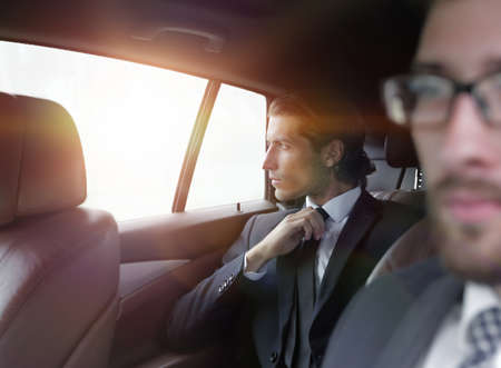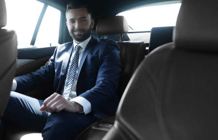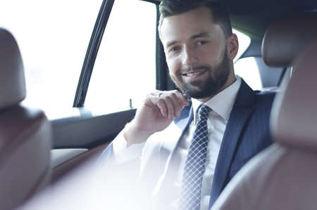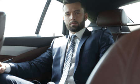 handsome businessman using his mobile phone in a modern car with a driver in center of the city. Concept of business, success, traveling, luxury