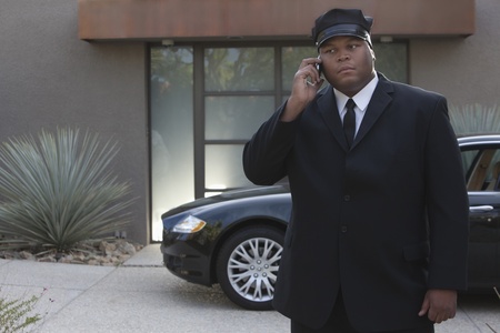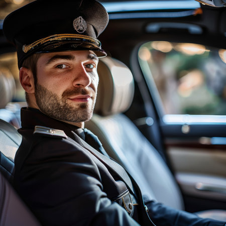 Professional driver, private chauffeur in luxury car, chauffeur service, man in uniform, professional transportation, auto rental, driver service, generative ai illustration