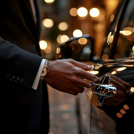 A close-up image of a man's hand opening a car door, depicting elegance, professionalism, and luxury during a night scene with vibrant bokeh lights in the background.