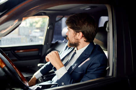 A man in a suit is driving a car to work, he is driving a car to work at the company. Vehicle driving concept.