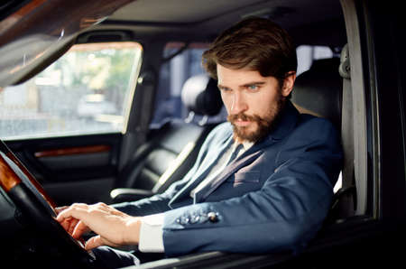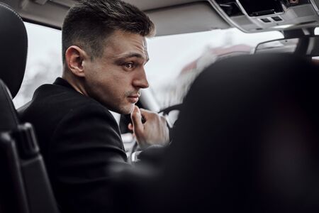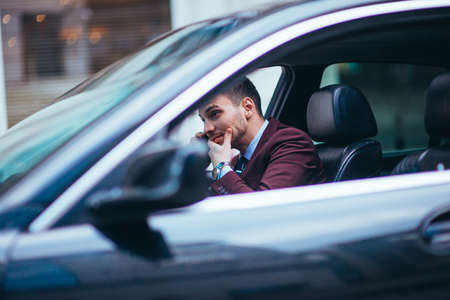 Conversations and phone calls, negotiations. Portrait of a young successful man in the car.