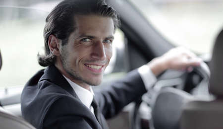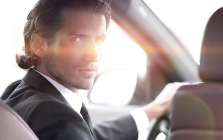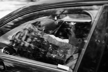 close up side view back view photo. man is sitting in the car and holding a steering wheel