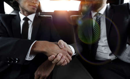 A manager sitting in his limo and discussing and planning his business movies, while applying a lot of body language in his conversation.