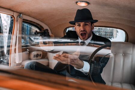 african american businessman in suit and sunglasses beeping in car at sunny day