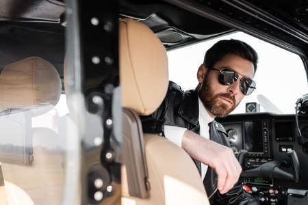 bearded pilot in stylish sunglasses and leather jacket sitting in cockpit of helicopter