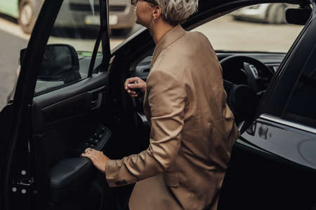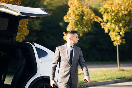 Stylish man getting out of car, personal chauffeur bringing businessman. Business man with briefcase get out from auto and walking to office building