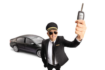 Professional chauffeur in a uniform showing a key in front of a black car isolated on white background
