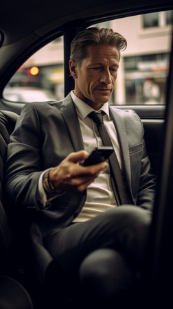 Sending an urgent message Side view of confident mature businessman typing message on his smart phone while sitting on the back seat of a car : Generative AI