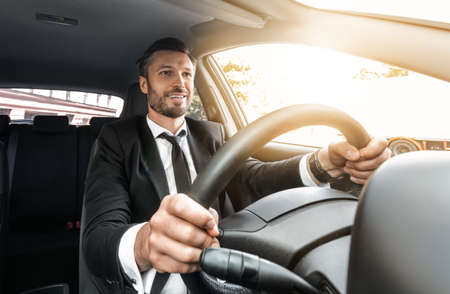 Happy rich businessman in suit driving car, going to airport early in the morning, copy space. Successful bearded entrepreneur smiling while driving his car, sun shining through the window