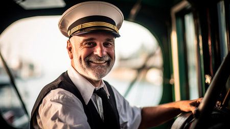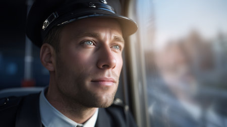 Conductor in uniform looks out the window of a train during twilight hours Generative AI