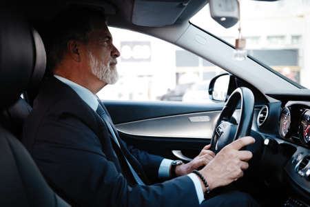 Middle aged man sitting in driver seat of modern car holding steering wheel with left hand and resting right hand on center console, wearing formal suit looking forward