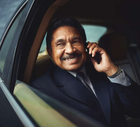 Making business calls on the move. Shot of a mature businessman using his phone while traveling in a car.