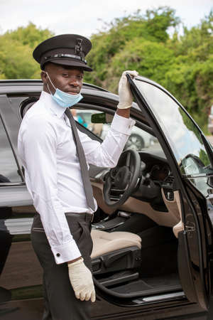 Hampshire, England, UK. 2020. A chauffeur entering his black car wearing a face mask and protective rubber gloves during the Covid-19 outbreak,