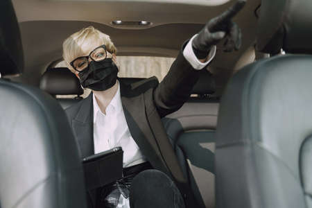 Businesswoman typing text message in car while wearing protective face mask for Covid-19 pandemic, selective focus
