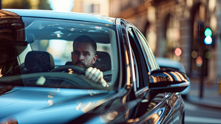 Man drives modern sedan on the road, symbolizing urban lifestyle and travel. Perfect for transportation or city-life themed content.