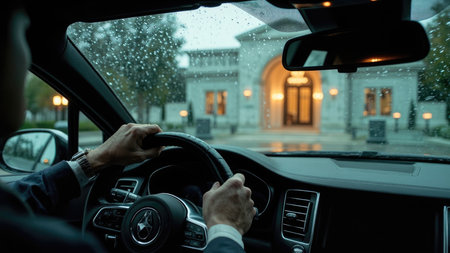 Caucasian middle aged man wearing gloves driving luxury car, hands gripping steering wheel, dashboard and instrument panel visible, professional chauffeur service concept