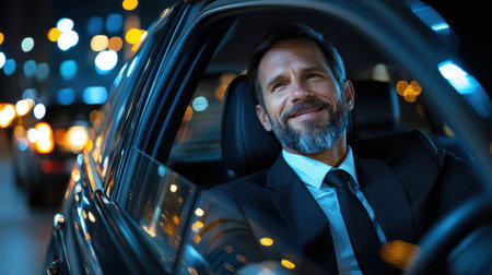 A man in a suit is smiling and driving a car at night. The scene is set in a city with lots of lights and cars. The man is enjoying his ride and is in a good mood