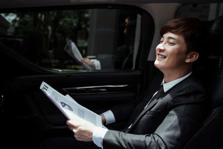 A pensive Asian man is sitting in the car, the driver is waiting and sad