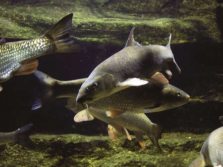 River fish under water surface line of aquarium