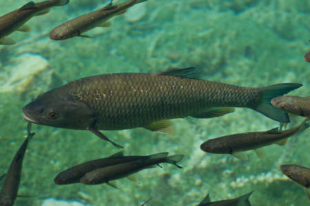 fish into clear water of plitvice lakes