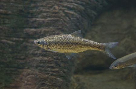 Underwater detail of an Eurasian minnow diving in a river. Eurasian minnow fish swimming under water in a lake provides a glimpse of the aquatic life or world for aquarium and fishing enthusiasts