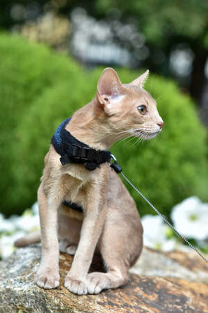 Young Abyssinian cat color Faun with a leash walking around the yard. Cute cat in harness sitting on the lawn. Pets walking outdoors, adventures on the green grass in the Park.