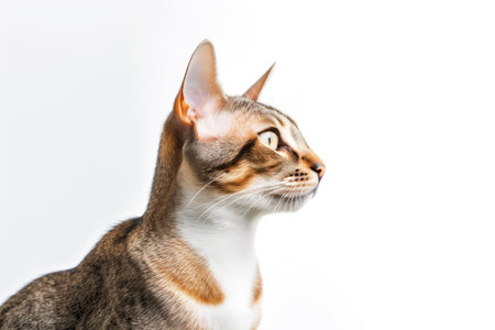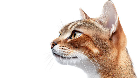 Young brown abessin cat Half of muzzle close up portrait on a white background Free place. Cat portrait close up, only head crop, cat stare at the viewer with space for advertising and text, cat head.