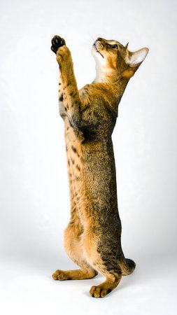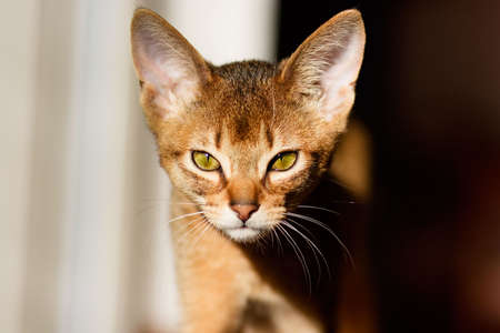 Abyssinian young cat sitting near white wall. Beautiful purebred short haired kitten