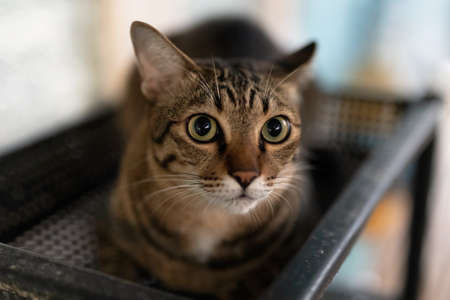 Tabby Brown Stripped cat being curious with big beautiful eyes looking away at home - Selective Focus