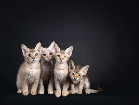 Row of 4 LaPerm longhair kittens, sitting beside each other. All looking towards camera an one meowing. Isolated on a black background.