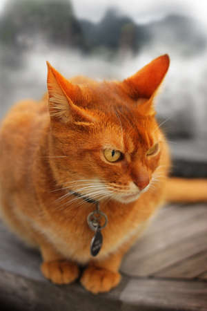 Beautiful Abyssinian cat in the garden. Selective focus.