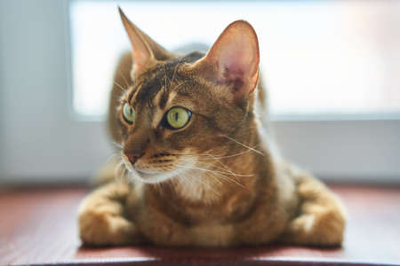 Cute red cat Abyssinian breed sitting on the floor in the apartment. Pet close-up